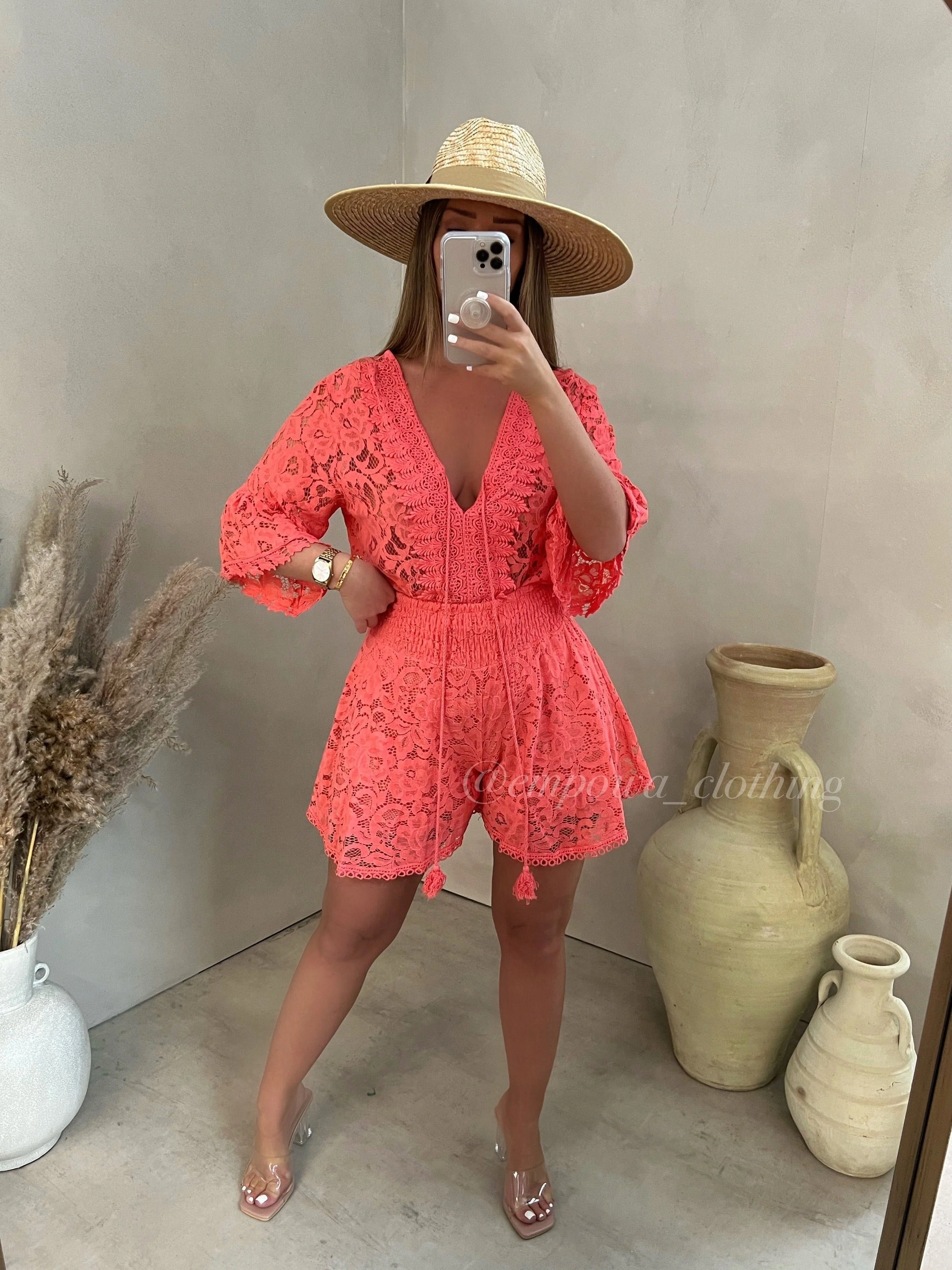 🔥ÚLTIMO DÍA 50% DE DESCUENTO - Traje casual corto de encaje con cuello en V dos piezas