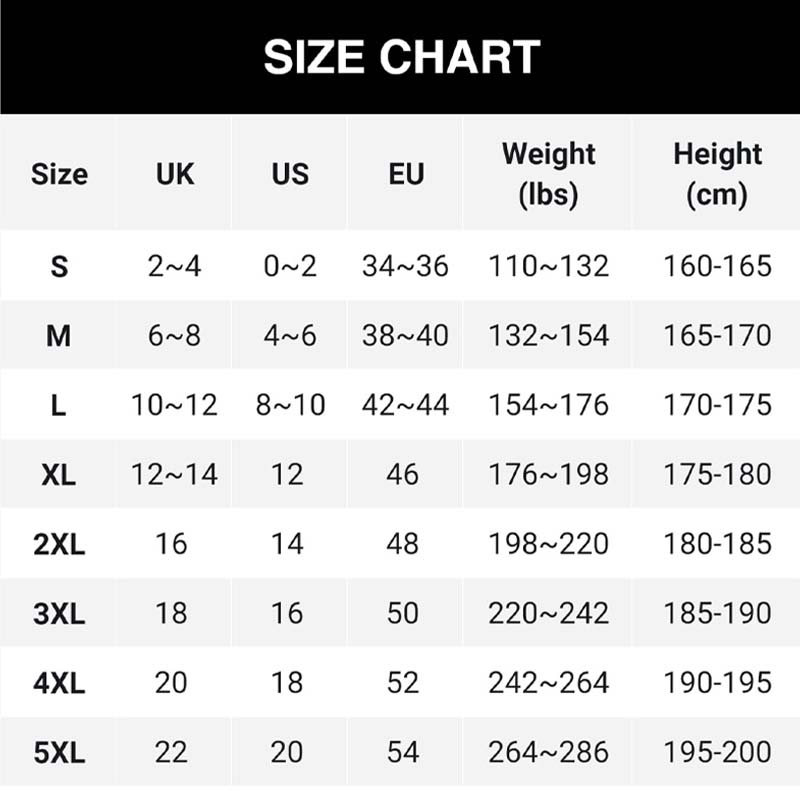 Tallas: S, M, L, XL, 2XL, 3XL, 4XL, 5XL